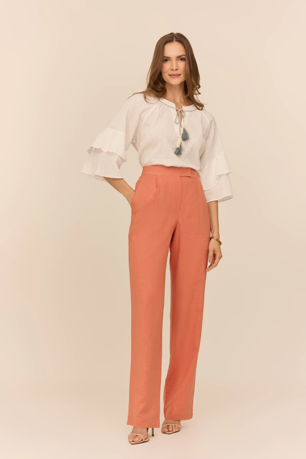 Bata confeccionada em cambraia de algodão com toque macio, garantindo conforto e caimento fluido. Seu design valoriza a feminilidade de forma delicada, com decote em “V” ajustável por cordão finalizado em tassels artesanais, que adicionam charme e sofisticação à peça. As mangas 3/4 amplas em camadas de babados trazem movimento e romantismo, criando uma silhueta solta e elegante. A barra assimétrica, com a frente levemente mais curta que as costas e leve fenda, reforça a leveza e modernidade do modelo, ideal para looks versáteis que vão do dia a dia às produções mais elaboradas.